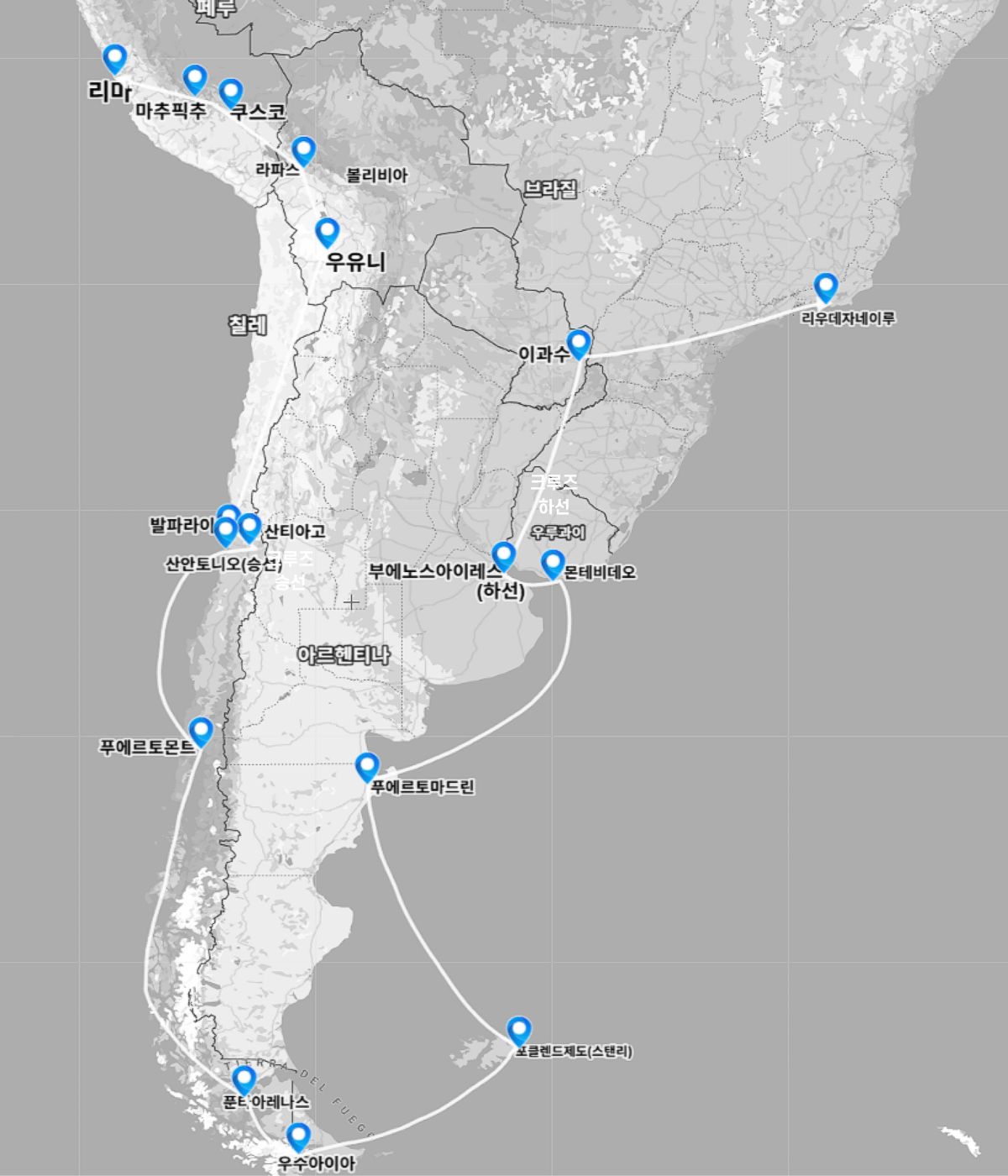 리마, 마추 픽추, 라파즈, 우유니, 산티아고, 푸에르토몬트, 푼타아레나스, 우수아이아, 포클랜드, 푸에르토마드린, 몬테비데오, 부에노스아이레스, 이구아수 폭포, 리우데자네이루
