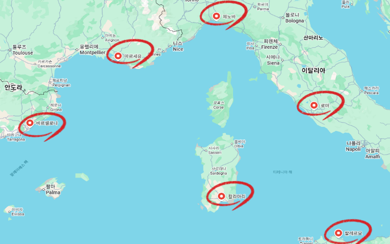 1. 로마 → 2. 제노바 → 3. 마르세유 → 4. 바르셀로나 → 5. 칼리아리(샤르데냐) → 6. 팔레르모 → 7. 로마