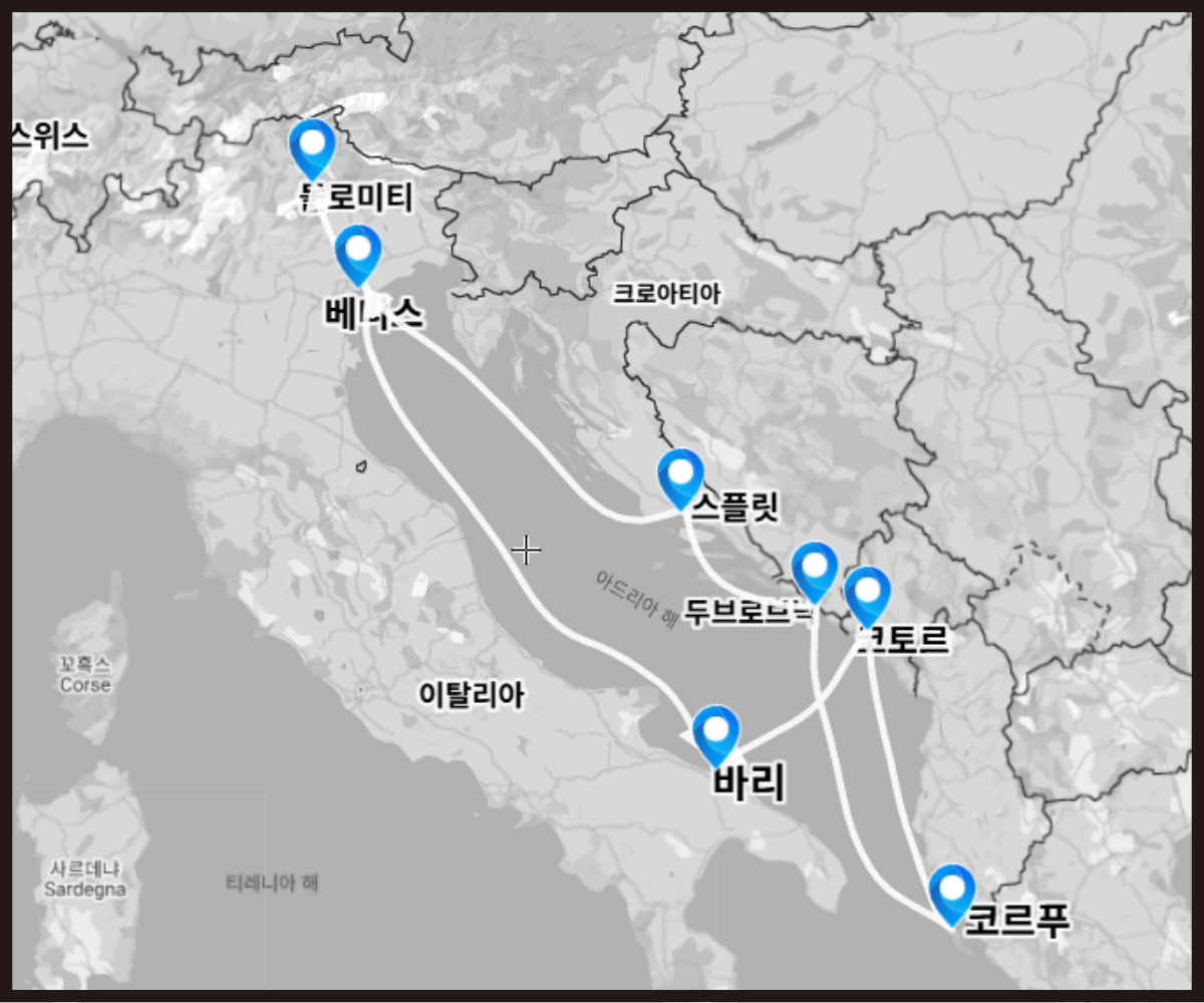 1. 돌로미티 → 2. 베니스 → 3. 바리 → 4. 코토르 → 5. 코르푸 → 6. 두브로브닉 → 7. 스플리트